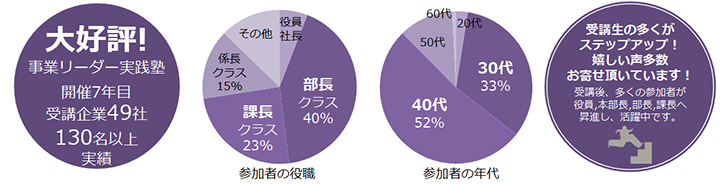 参加者は、大企業・中堅企業の中核を担う若手の幹部候補から、ベンチャー企業・外資系企業の社長・役員の方まで様々。講座参加後も塾生交流会・ゴルフ大会が開催される等塾生同士の交流や生涯の仲間作り、繋がりを大切にしています。