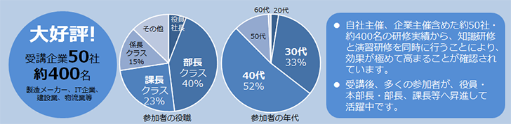 - 外部研修として複数人の受講、企業内研修見直しのための教育ご担当者体験受講、どちらもOKです。
